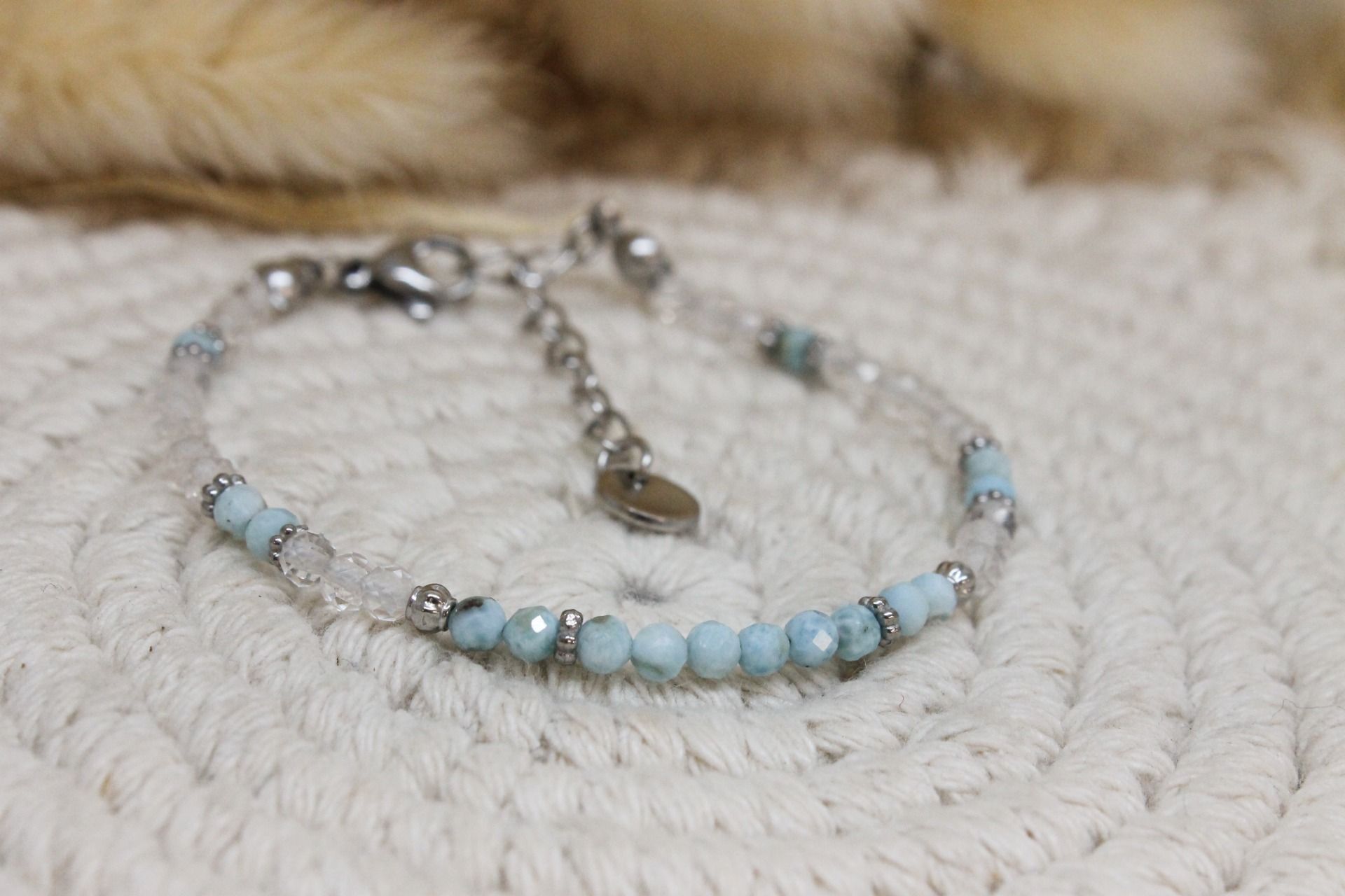 Bracelet fait en Larimar, Cristal de roche et acier inoxydable.